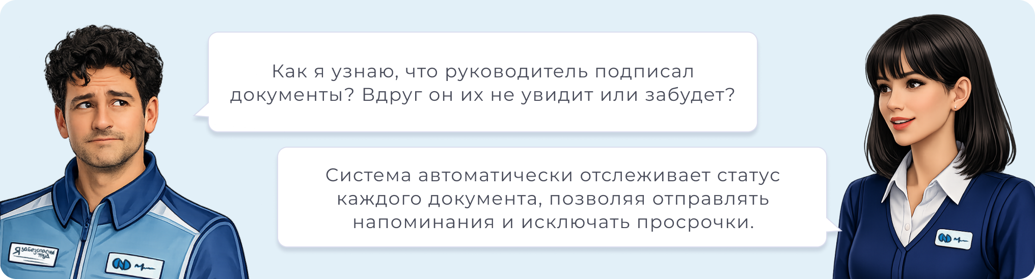 Контроль состояния документов онлайн – система автоматически отслеживает статус каждого документа: «Ожидает подписи», «Подписан»